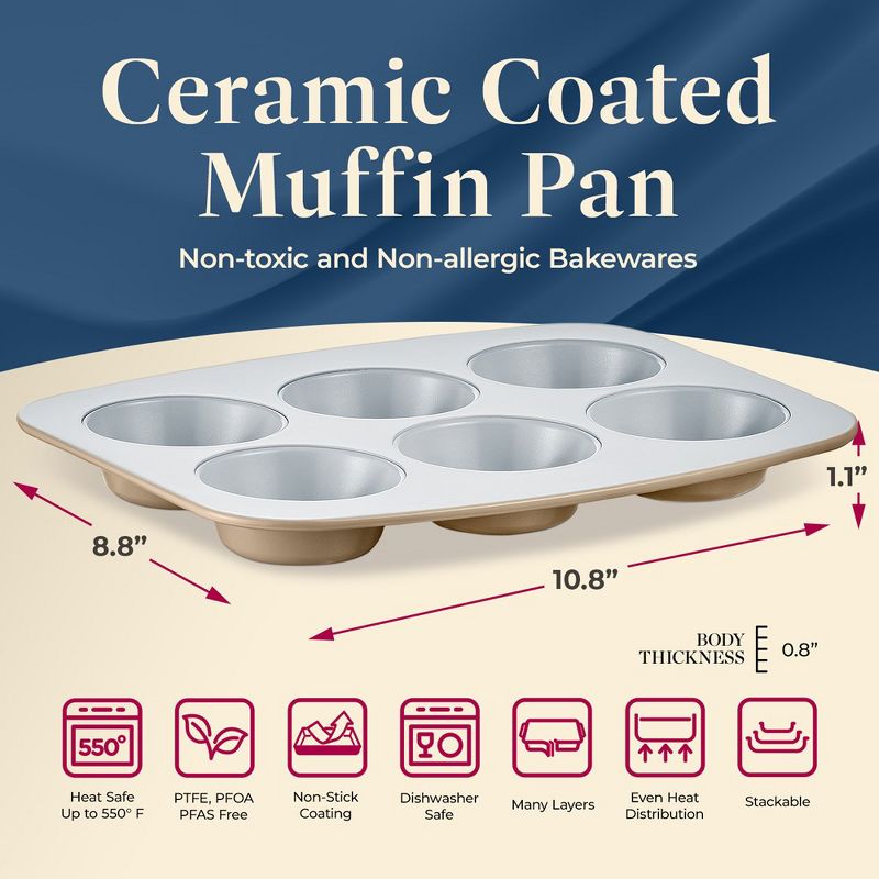 Bakken Swiss 6-Cup Cake/Muffin Pan Set - Aluminized Steel with Ceramic Non-Stick Coating - Proper Size for Versatile Baking - Golden