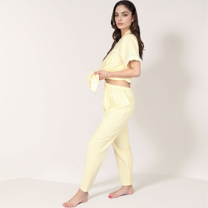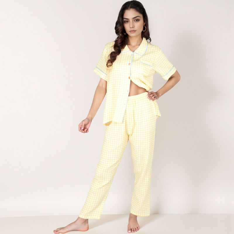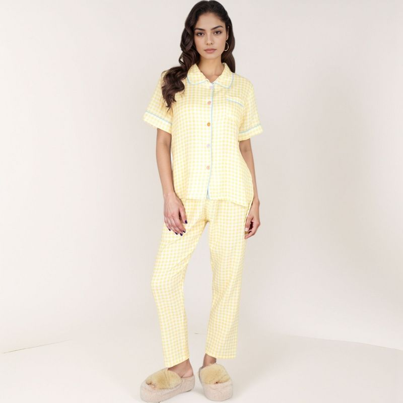 Anna-Kaci Lounge Women's Gingham Print Two-Piece Pajama Set with Short Sleeve Button Top and Relaxed Fit Pants - Medium, Yellow