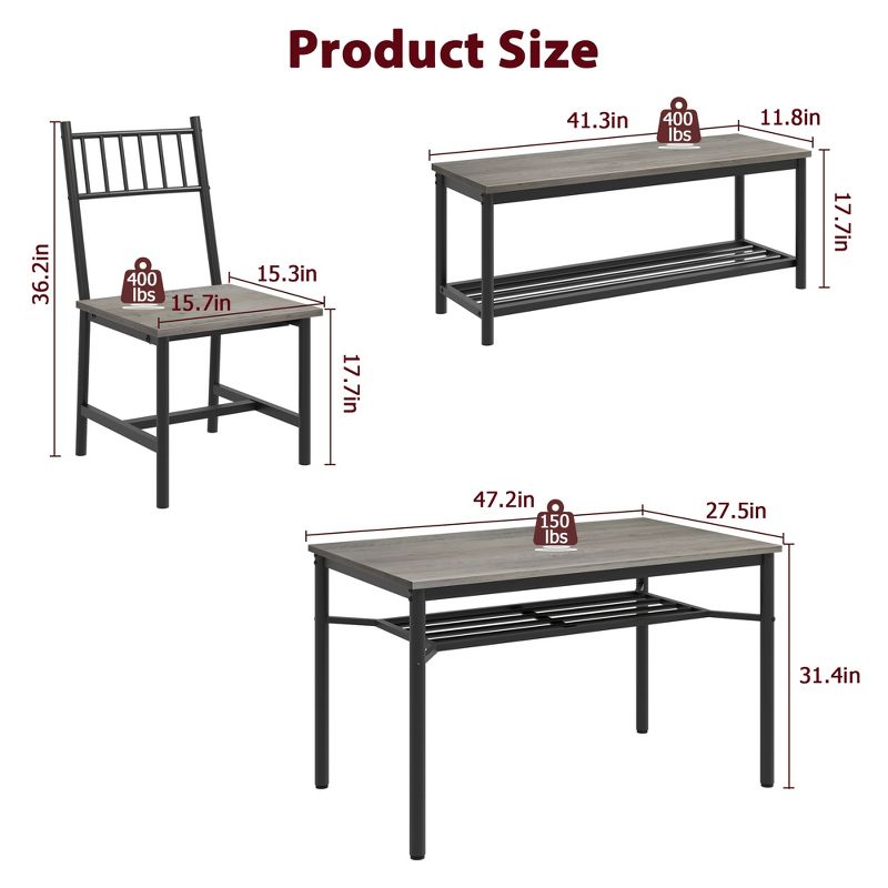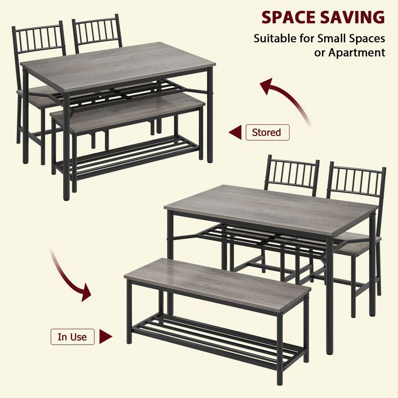 Kitchen Table with 2 Chairs and Bench, 4-Person Rectangular Dining Room Table Set with Wine Rack, Dining Table Set for 4 for Small Space, Rustic Grey