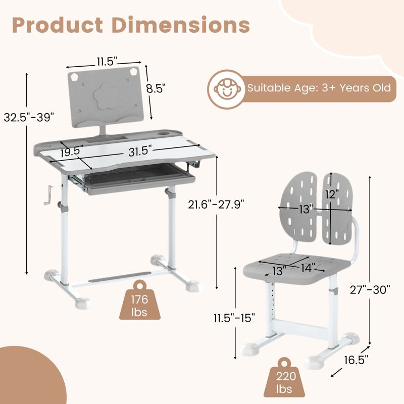 Costway Kid's Study Desk & Chair Set w/Tilt Desktop Book Stand Footrest Bar for Toddlers Grey