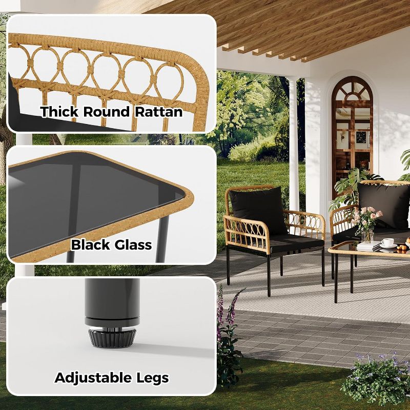 Acekool 4-Piece Outdoor Patio Set with Loveseat, Armchairs & Glass Coffee Table, Boho Rattan Conversation Set for Backyard, Porch, Balcony, Black