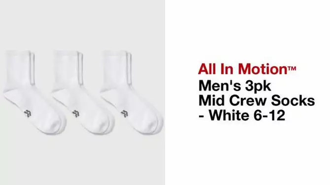 Men's 3pk Quarter Crew Socks - All In Motion™ White 6-12: Cushioned Heel, Flat Seams, Midweight Knit