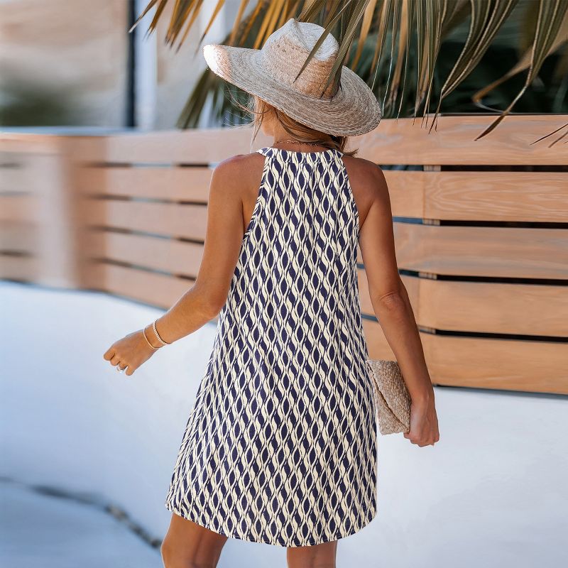 Women's Chic Geometric Print Mini Dress with Split Neckline - Cupshe-S-Blue&White