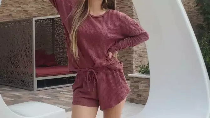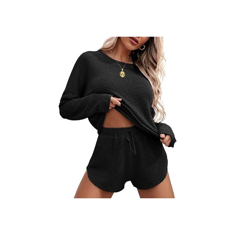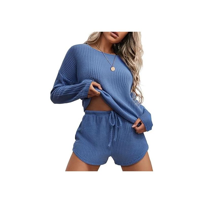 Ekouaer Womens Waffle Knit Pajama Sets Long Sleeve Top and Shorts Matching Lounge Set Loungewear Sweatsuit with Pockets Red L