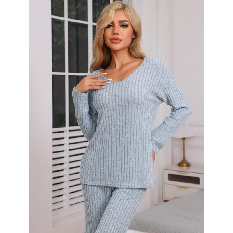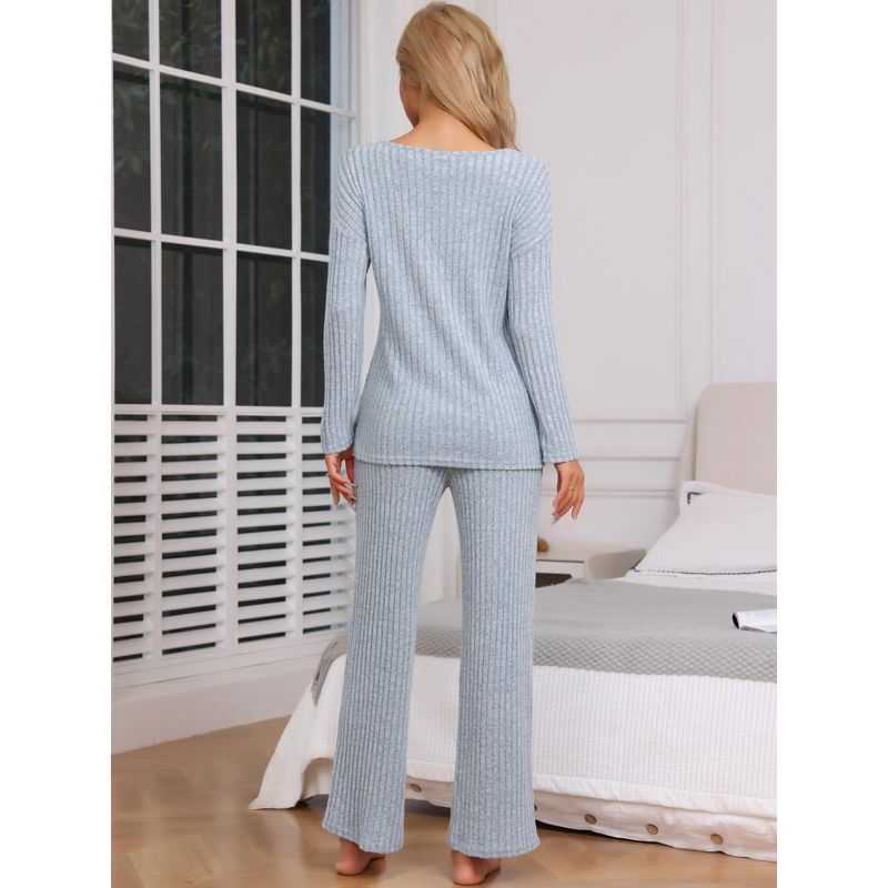cheibear Women's Ribbed Knit V Neck Long Sleeve with Pants Casual Pajamas Sets Blue Small