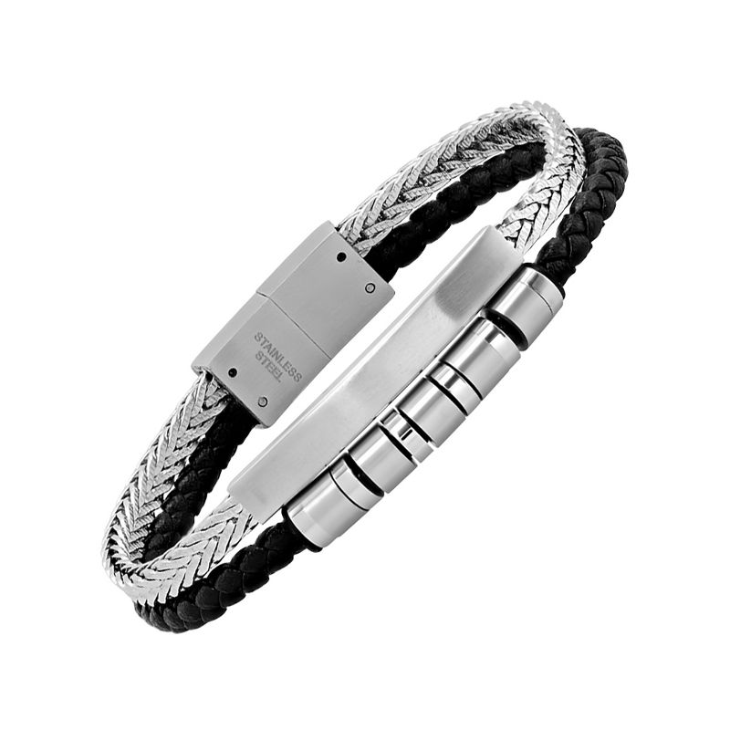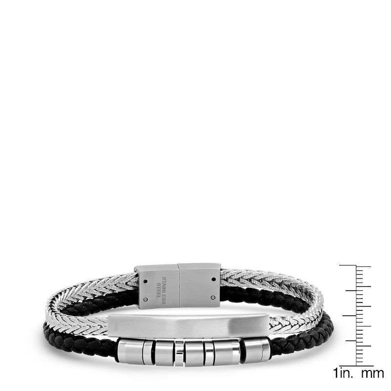 Steeltime Men's double layer black braided leather and stainless stseel wheat chain id bracelet