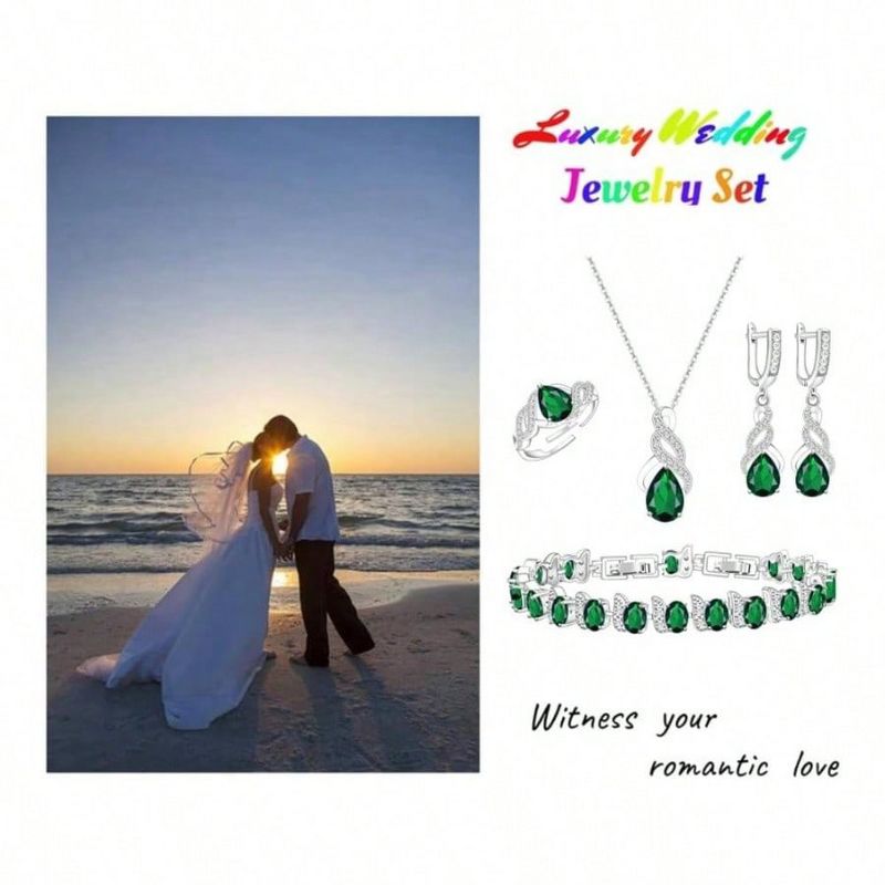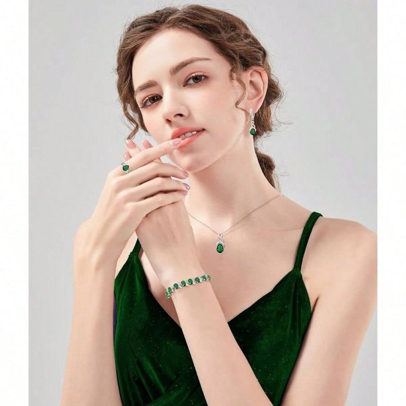 4-Piece Formal Jewelry Set: Teardrop Necklace, Earrings, Adjustable Ring & Bracelet for Women green Standard