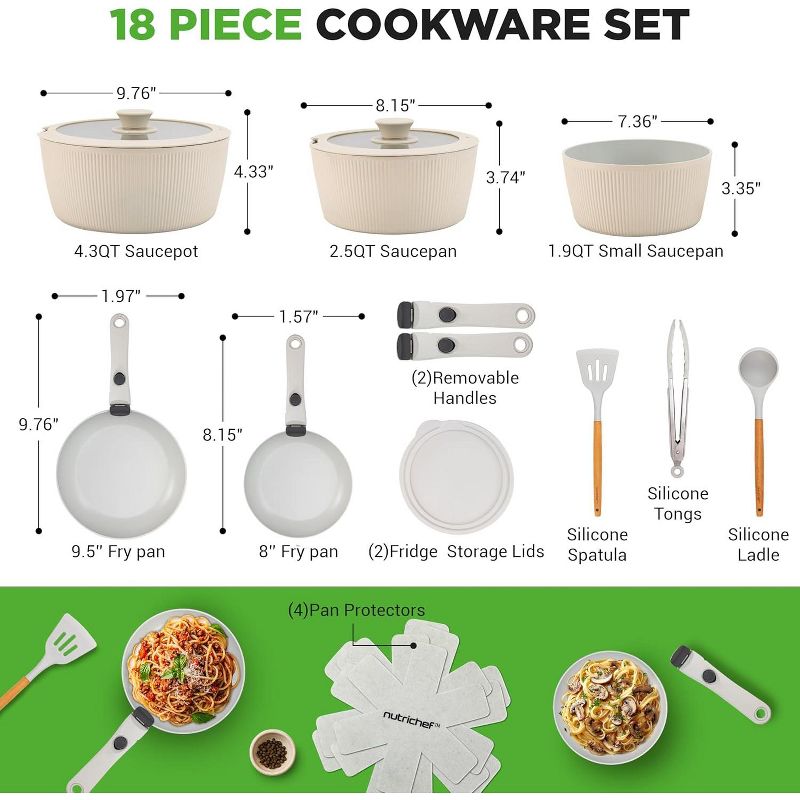 NutriChef 18-Piece Stylish Kitchen Cookware Set - Ceramic Nonstick Pots & Pans with Detachable Handles (Cream)