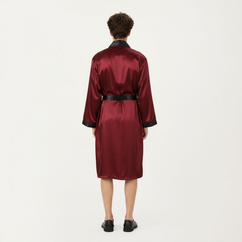 Anna-Kaci Lounge Men's Satin Robe with Contrast Shawl Collar Waist Tie and Front Pockets- Large, Burgundy