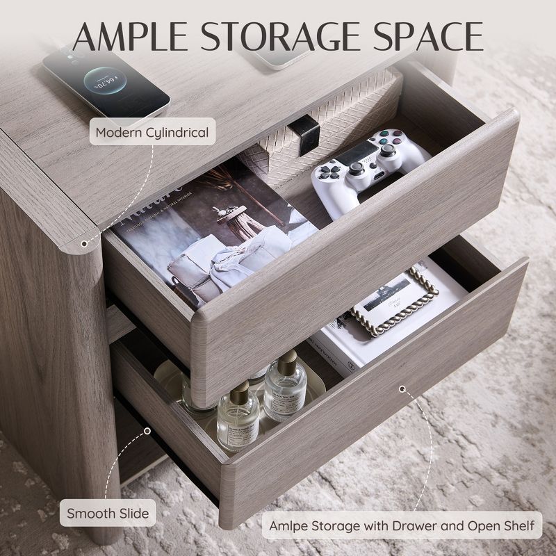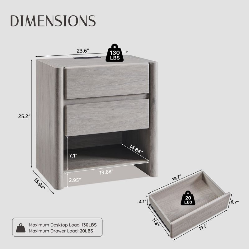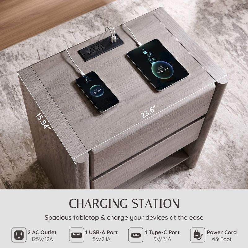 Night Stands Set 2 with Charging Station, Nightstand with Rounded Corner Design, 23.6" W Modern Nightstand for Bedroom, Sofa Side, Light Grey