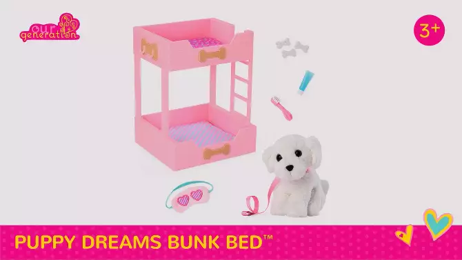Our Generation Puppy Dreams Pink Bunk Bed with Pet Dog Plush Dollhouse Set: Fits 18" Dolls, Includes 11 Doll Accessories